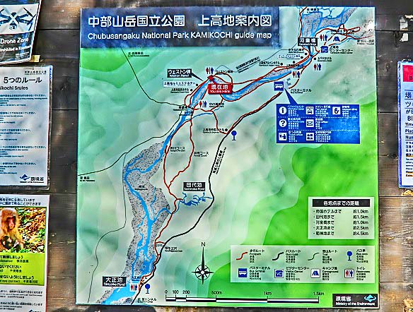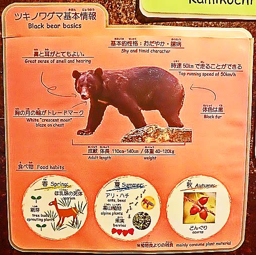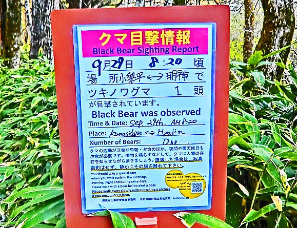 上高地を歩いていると、このような警報版を、各地で目にします。しかし、クマを目撃しても、わざわざ届けなど出さない人が多いので、実際には、かなりの人が目撃しているのだそうですよ。(私自身も、数年前に、わずか10メートル先で目撃しましたが、どこかに届け出る機会が無いまま帰宅しました)