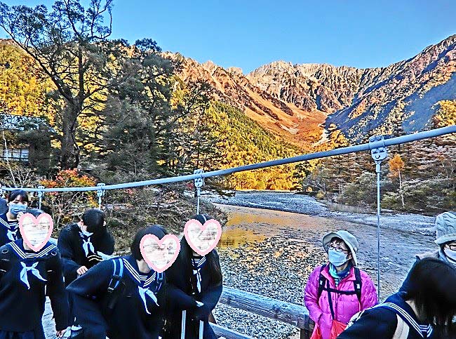 河童橋に戻ってみると・・・宿をチェックアウトして、バス乗り場へと向かう、大勢の修学旅行生たちが、楽しそうな笑顔を見せてくれました。