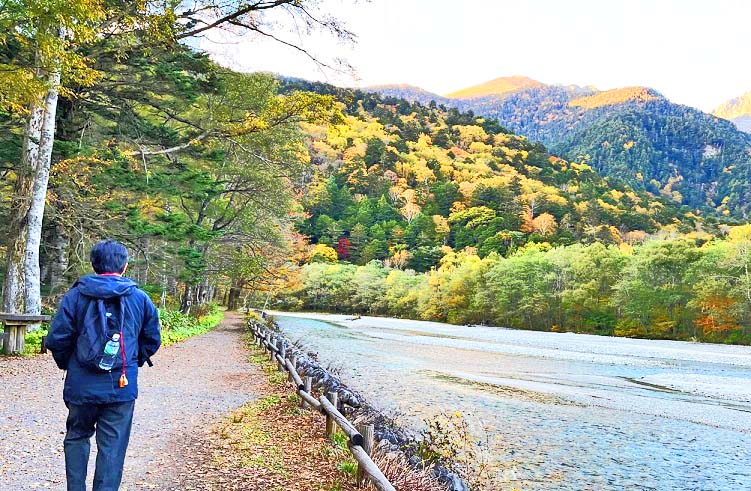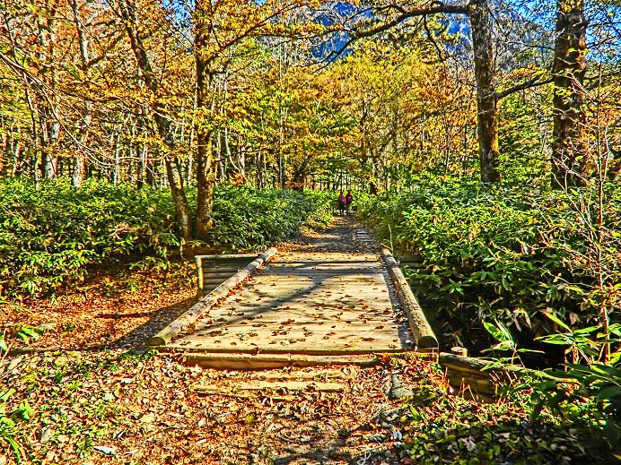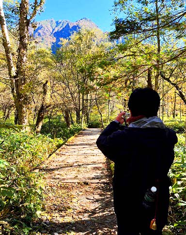 さあ、これから、上高地を代表する絶景スポットのひとつ、「岳沢湿原」(だけざわしつげん)を、目指して歩きますよ。
