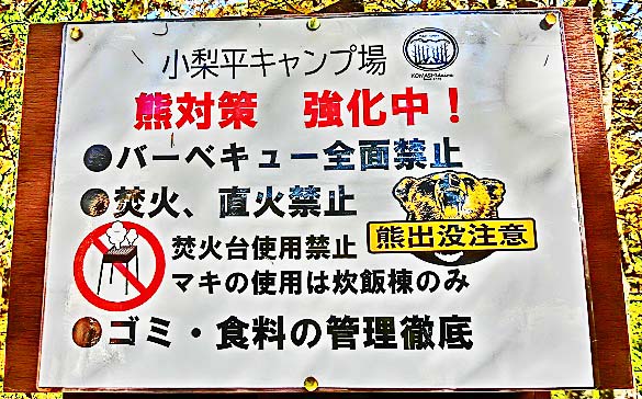 まずは、「小梨平キャンプ場」を訪れてみたところ、ただ今、「熊対策」を強化中とのこと!!