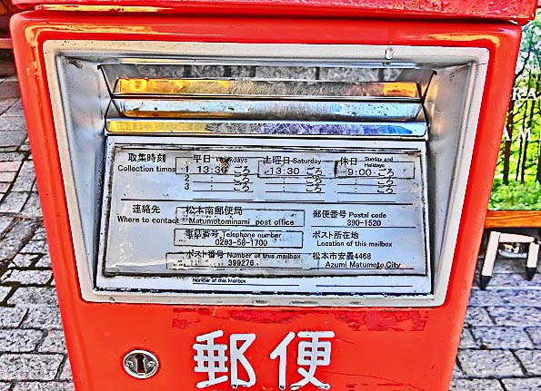 川岸に上がって、「興味深い被写体」(笑)を探しながら歩き回っていると、郵便ポストを発見・・・毎日、一度は、郵便局員さんが来てくださるわけですね。連絡先は、「松本南郵便局」となっており、調べてみると「松本市平田東」にありますので、このポストの場所からは、52キロ(車で1時間20分程度)も離れていますが・・・担当の郵便局員さん、誠に、ご苦労さまです。