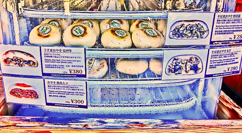 信州名物、「おやき」を売るお店も発見・・・「信州牛」「鹿肉」「野沢菜」「なす」の4種類から選べますので、う〜ん・・・悩むところです(笑)。