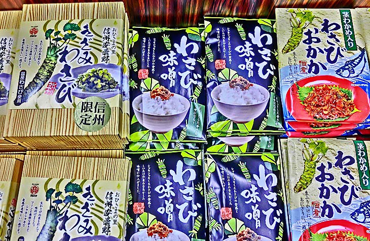 土産物屋さんに入ってみると・・・やはり、信州・安曇野(あづみの)と言えば、「わさび」が名産品ですよね。先ほどご紹介したポストの写真に、「住所」の記載も写っていますが、ここは、「松本市安曇(あづみ)」なんですから。