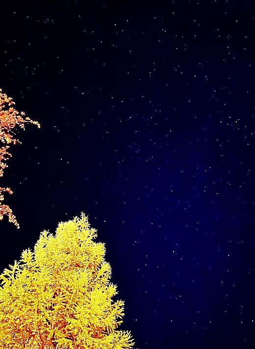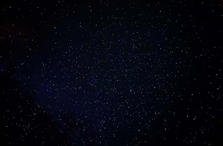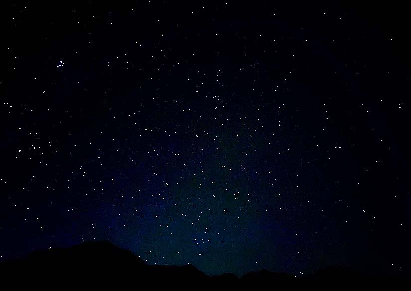 次の写真の左上部分で、数多くの星たちが集まって、固まりのように輝いているのは、有名な「すばる」でしょうか・・・