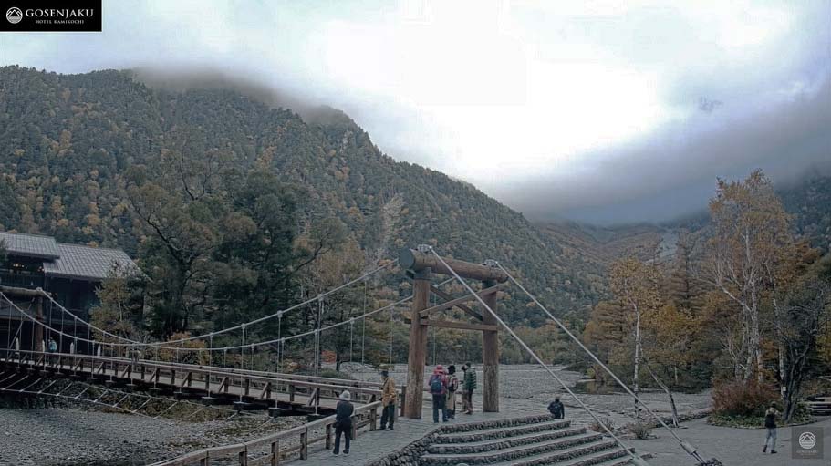 早朝に目が覚めてしまったので、つい、私が個人的に上高地を訪れる際の定宿にしている、河童橋の真横に建つ「五千尺ホテル」のサイト(24時間ライブビューイング)を開いて、「上高地・河童橋の現在」を確認してみると・・・