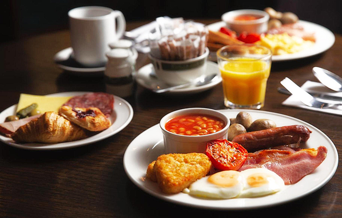 (ホテルのブッフェで、各自、英国名物の「イングリッシュ・ブレクファースト」をイメージしながら朝食)