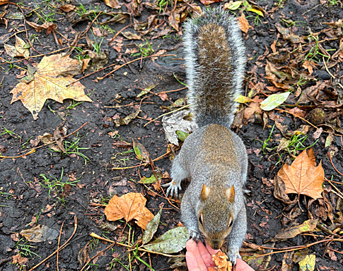 9:10〜20頃 「グリーンパーク」のバス停で下車し、パーク内で、野生のリスたちを観察しながら、クルミを提供。(たくさん住んでいるため、いつでも交流でき、特に朝は空腹なので、大喜びで近づいて来て、手から直接に取って食べますよ)