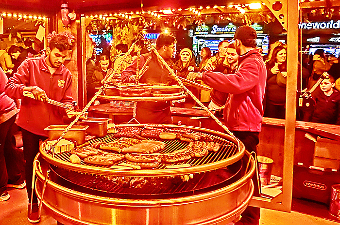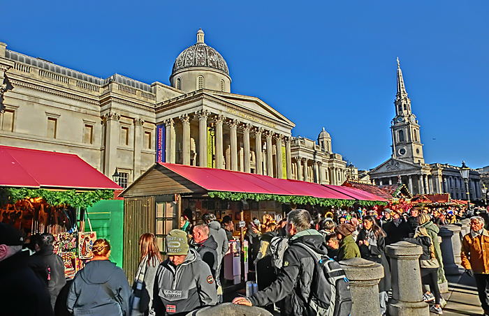 こちらが、「ナショナル・ギャラリー」(国立美術館)と、その前に広がっている、クリスマス・マーケット・・・英国のクリスマス・マーケットでは、客の多くが(子供ではなく)大人であり、しかも男性(おじさん)が多いんですよねぇ、なぜか(笑)。