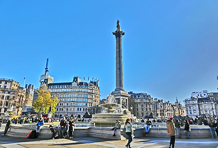 こちらが、「トラファルガー広場」・・・中央の塔の上では、フランスの方向を向いた「ネルソン提督」が、「また攻めて来たら許さんぞ!!」と、にらんでいますよ。かつて、欧州大陸を征服したナポレオン軍が、ついに海を渡って英国まで攻めてきた時に、「トラファルガーの海戦」で逆転勝利して追い返したのが、国民の英雄・ネルソン提督なのですから・・・(提督自身は、勝利を収めた後に、負傷の悪化で戦死しました)