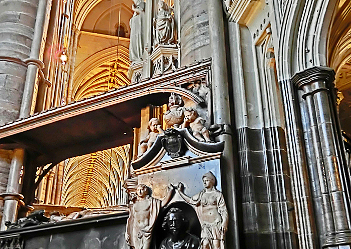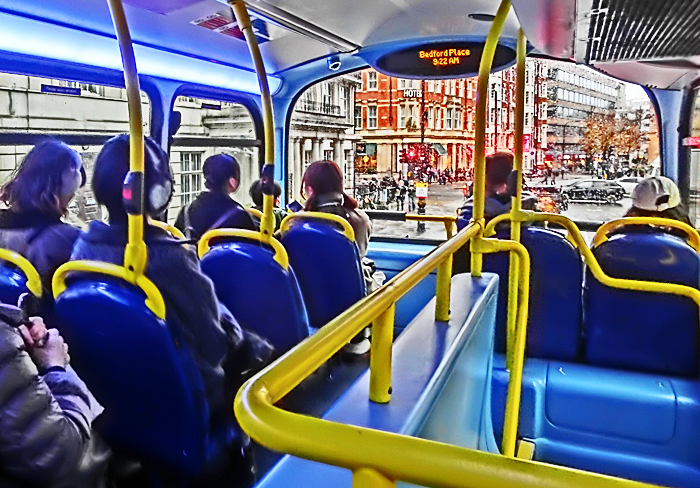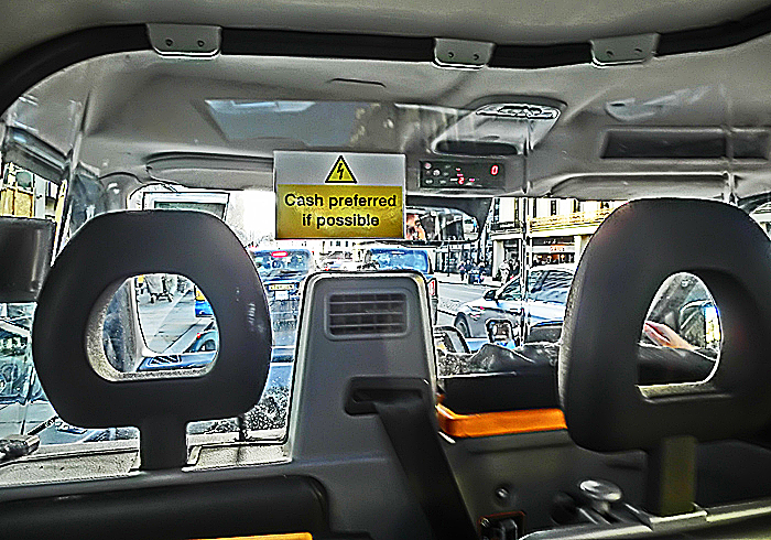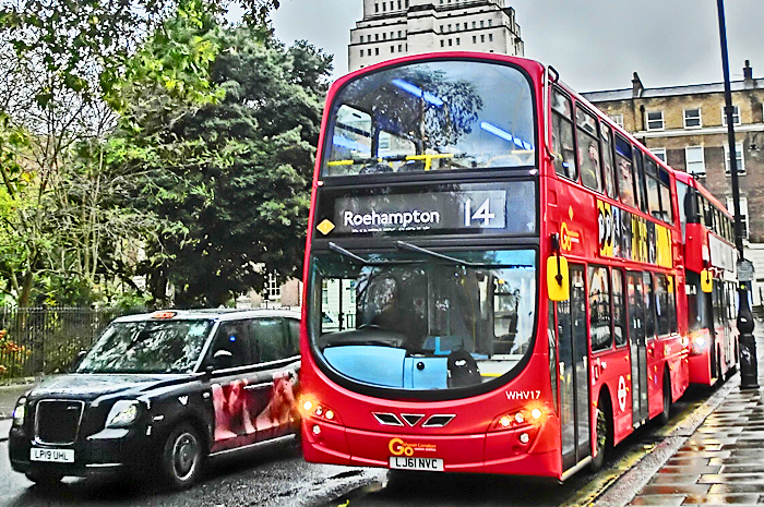手前に写っているのは、ロンドン名物の、黒くて大きなタクシー(ブラック・キャブ)であり、その後方には、こちらもロンドン名物の、赤い2階建てバスが見えていますよ・・・