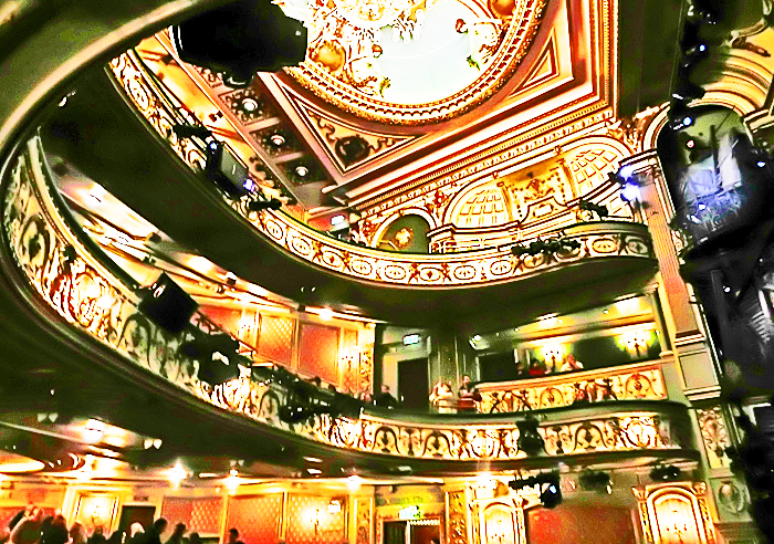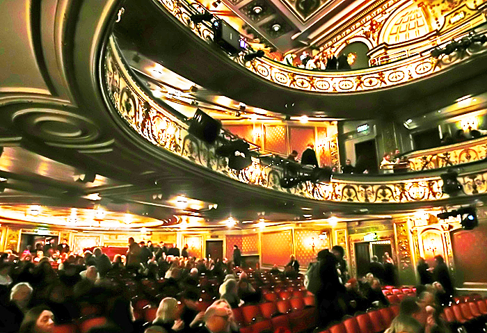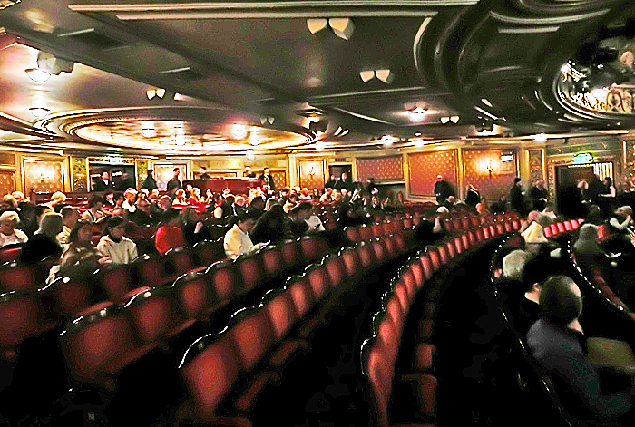 振り返ると、2階席、3階席が、覆い被さるかのように迫っていますよ・・・一般的に、最も観劇に適しているのは、2階の最前列中央部分だとされており、ロイヤル・ファミリー(王室の方々)などが座る貴賓席(きひんせき)は、この部分に用意されます。