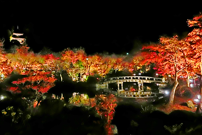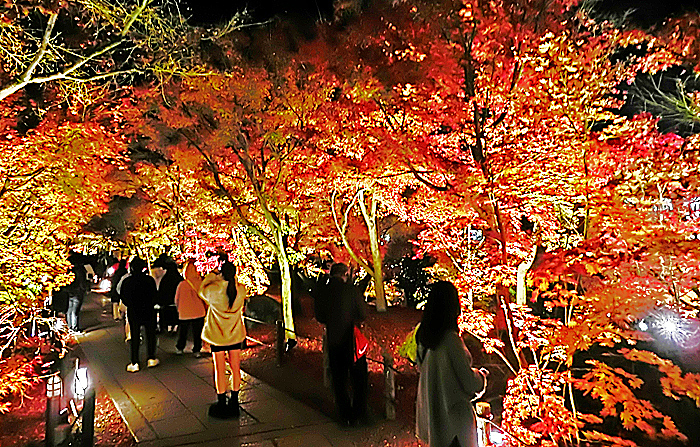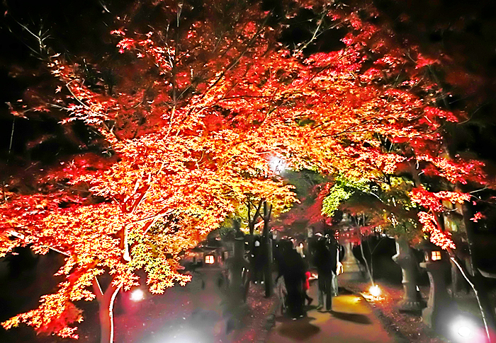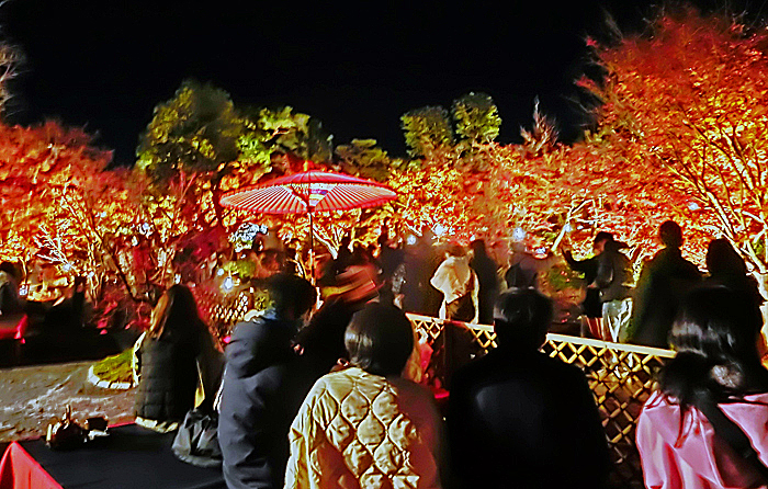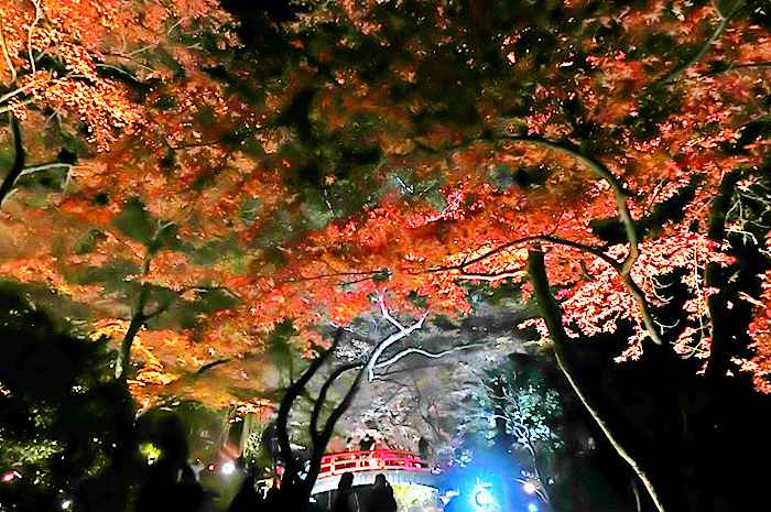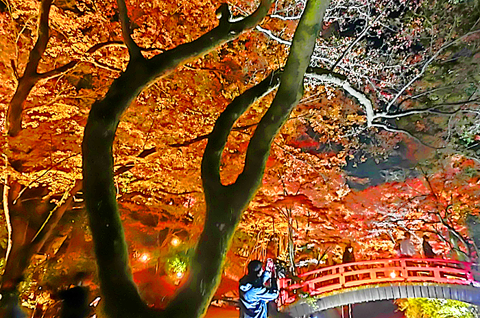 夜間のライトアップも、いよいよ、本日が最終日・・・「すでに紅葉は終了しているだろう」と、あきらめながらも(念のため)訪れてみましたが・・・予想以上にモミジの葉っぱが残っており、一同、「こりゃ予想外!!」と大喜び(笑)。