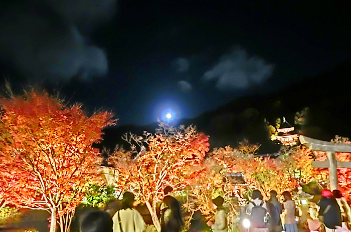 しかも、我々の到着を待っていたかのように、ちょうど最適なタイミングで、まん丸のお月さまが、東山(京都盆地の東側を南北に走る山脈)の稜線から、まぶしく登場してくれたところですよ!!