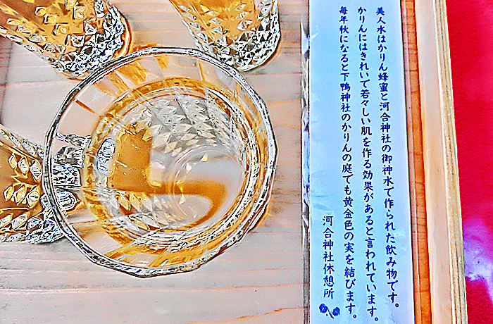 境内のお店では、「美人水」なる液体が販売されており、「男性が飲んでも『美男効果』あり」とのことなので、さっそく活用・・・「かりん」と「はちみつ」が融合した、とろけるような美味しさですよ。