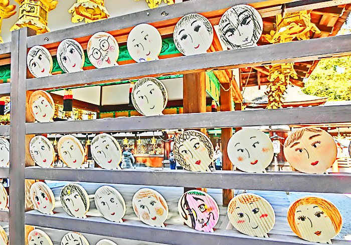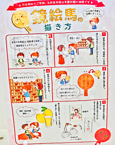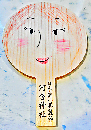 次に、仲間の女性たちが、興味シンシンで挑戦したのが、こちら・・・「鏡絵馬」(かがみえま)という名物ですよ。簡単な下絵が描いてある木製の札(ふだ)に、「なりたい顔」を描いて神様に奉納すれば、その夢が叶うのだそうですが・・・