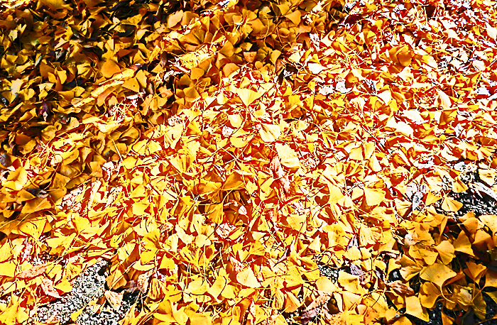 踏んで歩くのが申し訳ないほどの美しさで、参道に降り積もっている、雅(みやび)なイチョウたち・・・
