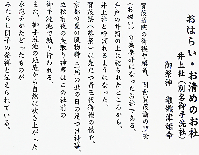 なるほど、ここは、身を清めるための「お祓い」(おはらい)の際に活用する、「御手洗(みたらし)池」にまつわる祠であり、かの有名な「みたらし団子」の発祥の地なのだそうですよ・・・「みたらし」の語源は、身を清めるための「御手洗池」だったのですね。