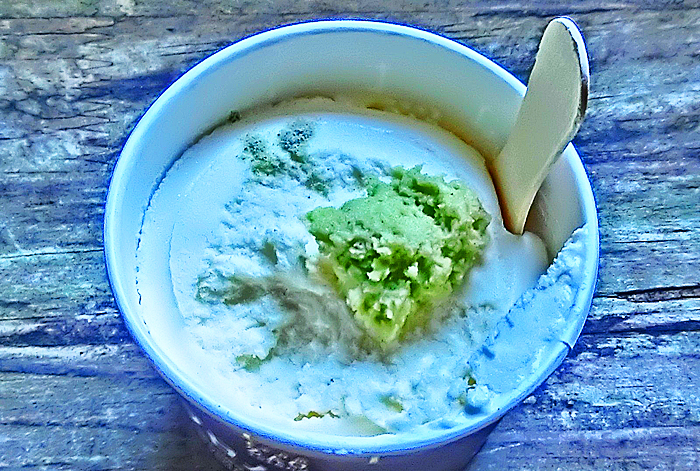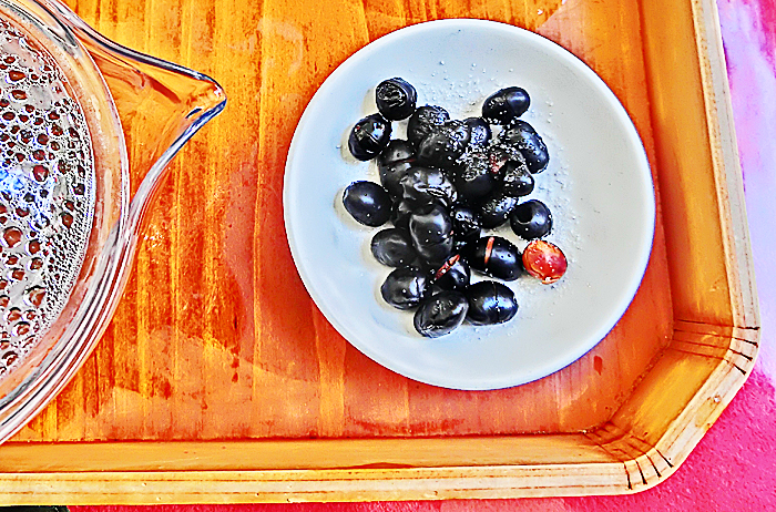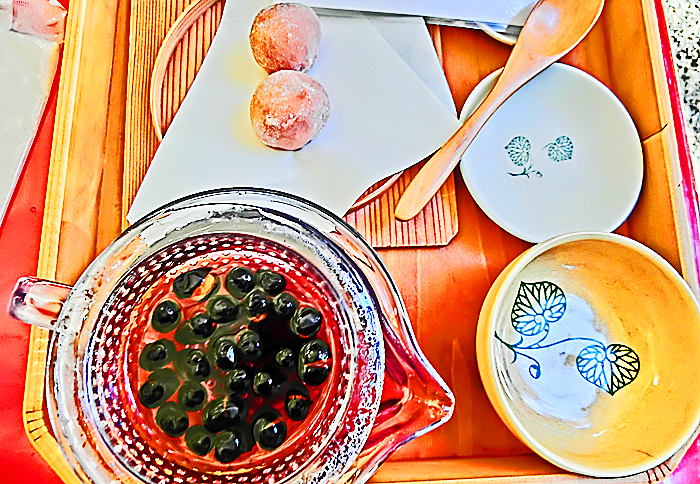 試しに購入してみると・・・左上の小さな丸2つが「申餅」で、左下のグラスに入っているのは、香ばしい「黒豆」ですよ。