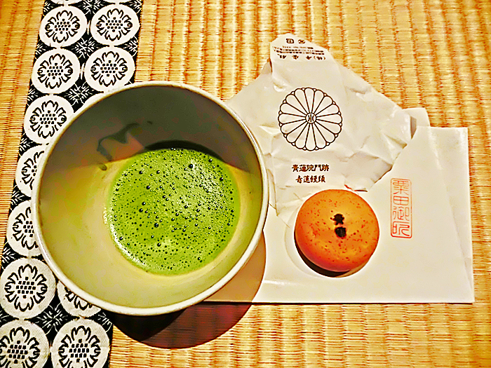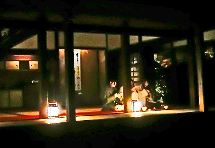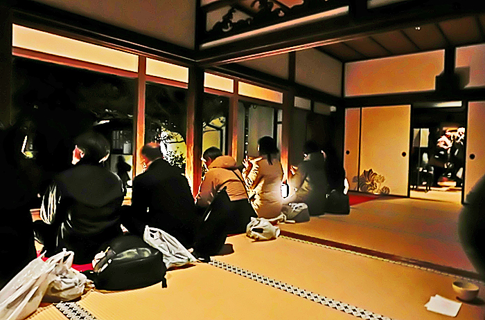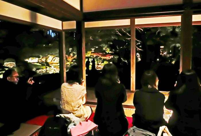 まずは、お茶屋さんに入って、お饅頭(まんじゅう)と抹茶をいただきながら、ライトアップされた美しい庭園を、ゆっくりと観賞・・・