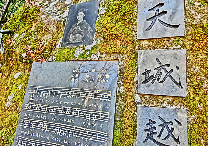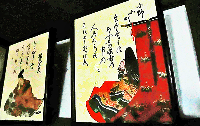平安時代を代表する美女・小野小町さんの歌が掲げてありますが、あまりにも美人すぎて絵画の表現力を超えているためか、やむを得ず、後ろ姿で描写・・・「その御顔は、ご想像にお任せします」、という意味なのでしょうね。