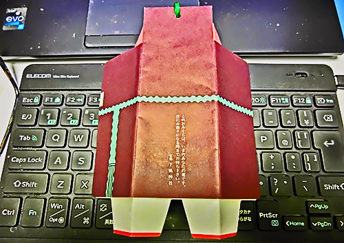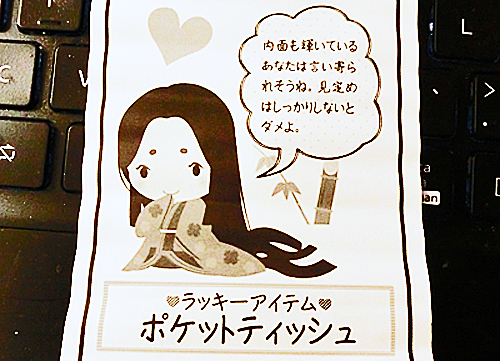 下鴨神社の境内にある、恋愛専門の「相生(あいおい)社」で入手したのが、こちらの「恋みくじ」・・・・「男性用」「女性用」に分かれていますので、こちらは、平安貴族の男性の衣装を、デザインなさっているようですね。
