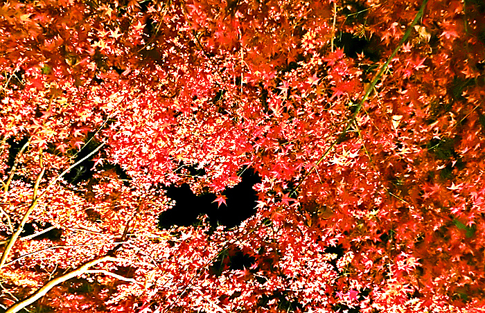 見上げると、モミジの葉っぱで夜空が埋まって、ところどころに「穴」が空いているだけの状態・・・この現象を、京都では「モミジ天井」と読んで、大いに珍重するんですよ。