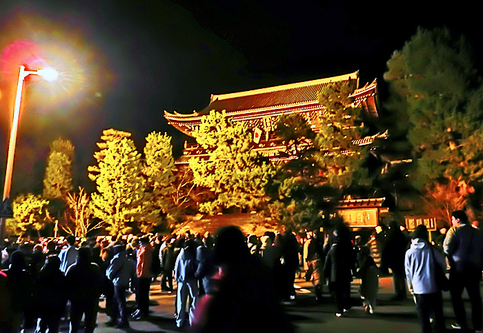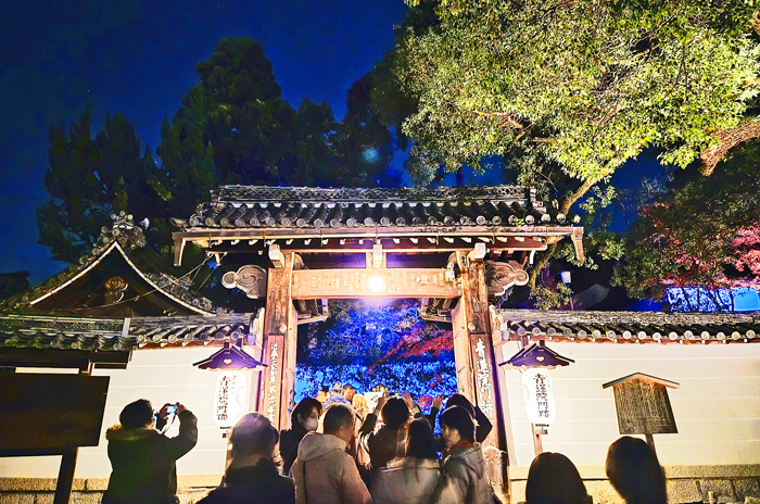 さて、その日の「夜の部」に訪れてみたのが、こちらの「青蓮院」(しょうれんいん)・・・5年ぶりにライトアップが再開されたそうなので、久しぶりの訪問となりました。次の写真の左端で、時代遅れのデジカメを手にしているのが、私自身ですよ。