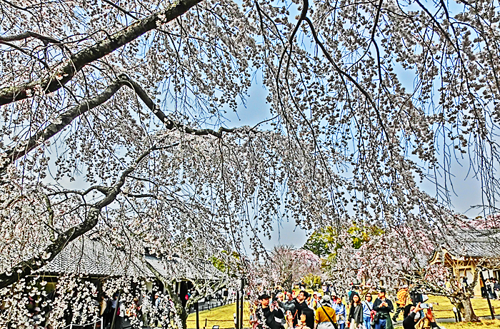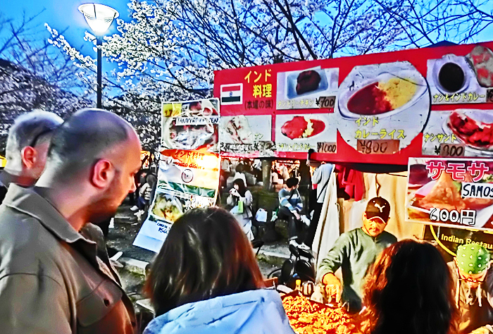 桜の時期も後半に入って、京都・東山の「円山公園」を再び訪れてみると・・・屋外の大宴会場では、ようやく、桜が8分咲きになり、いい感じのお花見気分が味わえましたよ。ただし、ご覧のように、1週間前には「外国人観光客」さんたちで占められていた座敷が、この夜には、一昔前の光景がよみがえってきたかのように、「背広姿のオジサン」たちで、占拠されているのです。