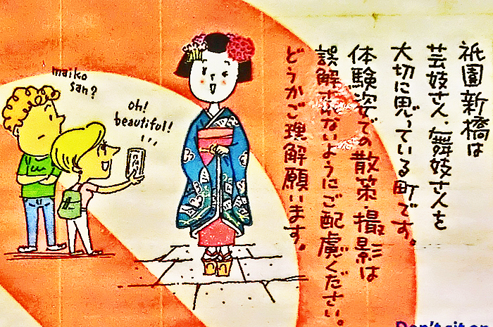 なるほど・・・本物の「舞妓」さん(まいこ:修行中である10代の女子学生の身分)&「芸子」さん(げいこ:遅くとも20歳までに修行を終えて一人前の職業人になった身分)と違って、単に「舞妓や芸子のレンタル衣装を着て歩いているだけの観光客」たちには、本物のフリをして外国人観光客に写真を撮らせないで欲しい、というお願いですね。確かに、本物の舞妓さんたちが、キャッキャッと大騒ぎでピースサインをする姿など、見たことがありませんし、日本人ならば「ニセモノだな」と判別できますが、外国人さんたちには区別できないので、これは大問題ですよねぇ・・・