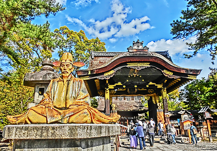 その後に、徒歩数分の場所にある、「豊国(とよくに)神社」を訪れたりと、「桜」よりも「歴史」をテーマにして、歩き回りましたよ。豊国神社は、あの「豊臣秀吉」を祀(まつ)っている神社ですから、ほら、境内には、秀吉の立派な銅像が・・・(小さな体格と貧相な顔で知られ、良くも悪くも「猿」の愛称で呼ばれていた秀吉の外見を、見事に想像させる作品ですよね。この銅像の創作者さん、素晴らしいお仕事ぶりです!!)