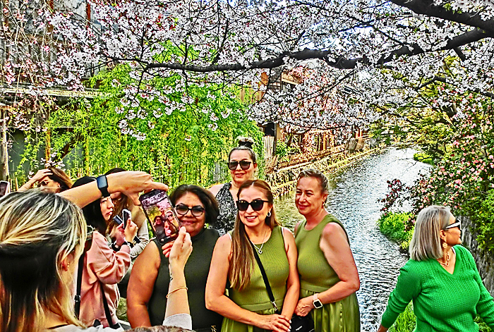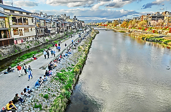 さて、京都の桜と歴史を満喫した我々が、「光の学校」へ戻るために、「四条大橋」から「鴨川」(かもがわ)を見下ろしてみると・・・