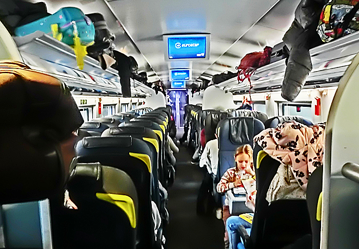 こちらが、ユーロスターの車内・・・高価な特等席もあるのですが、わずかな移動時間なので、ケチって(笑)普通席を予約してみたところ、なんと、私の隣りの席には誰も来ることがなく、悠然と、1人で2つの席を活用しながら移動できました。ご覧のように、車内は完全な満席状態でしたから、私の隣りだけが空席になっていたのは、まさに奇跡的な幸運!!・・・連日連夜、心身を酷使しながら頑張っている私に、何者かが、ご褒美をくださったのでしょうか?