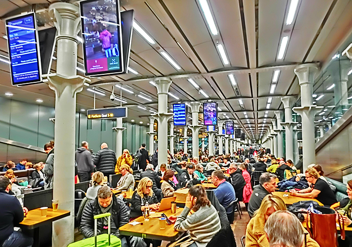 ユーロスターが発着する「セント・パンクラス」の駅では、ご覧のように、大勢の旅行者たちが乗車を待っており、さまざまな言語が飛び交っていますよ。
