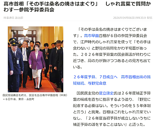 さっそく、ネット上のニュースを検索してみると、確かに、高市首相の口から、「その手は桑名の焼きはまぐりでございます」という、珍しいお言葉が!!
