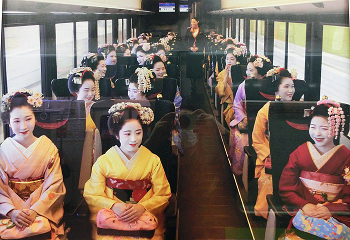まずは、京都市街地の中心部(三条御幸町)に位置する「光の学校」を、15時頃に出発して、京阪電鉄の「三条」駅から、全席指定の「プレミアムカー」に乗車・・・まさか、大勢の舞妓さんたちと、一緒になるとはねぇ・・・お嬢さんたちも、大阪万博を観に行くところなのでしょうか?(笑)