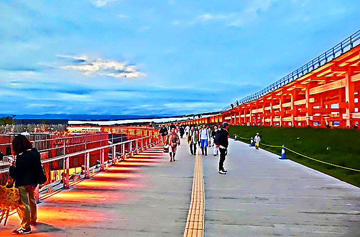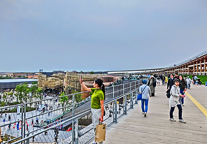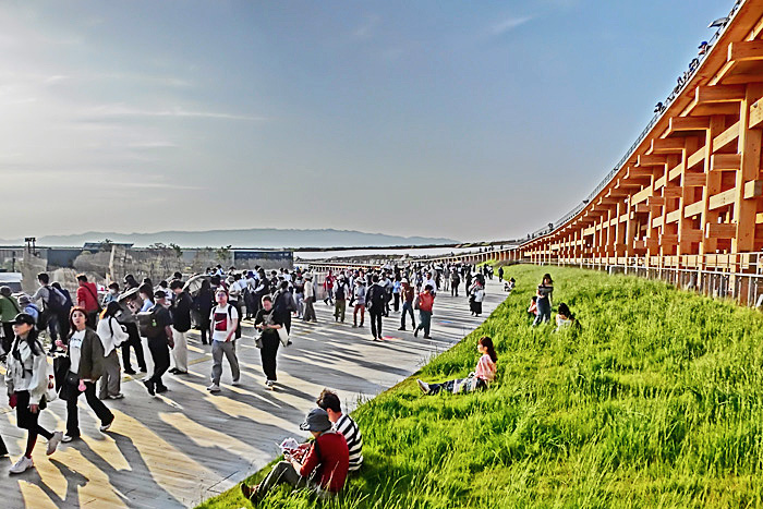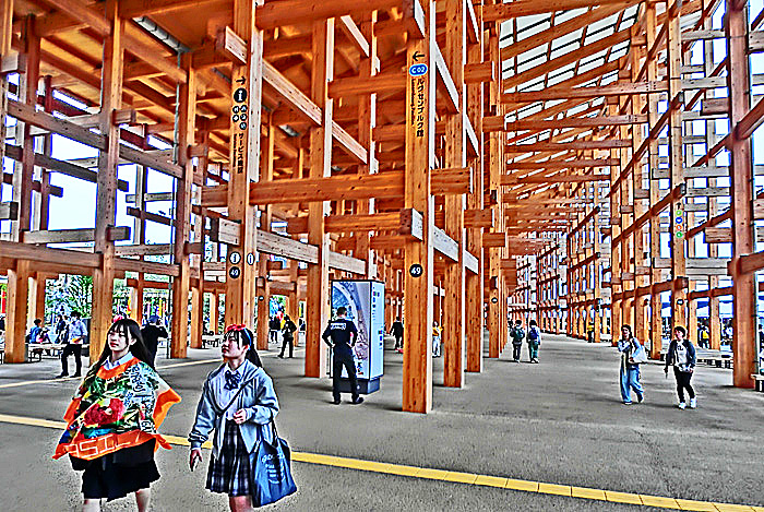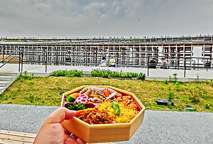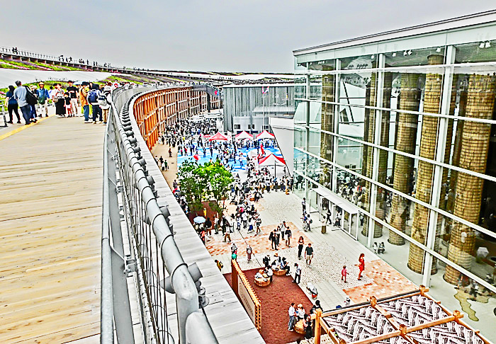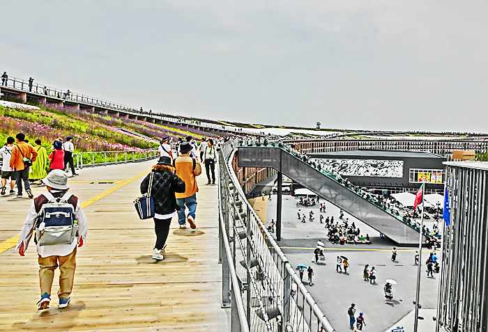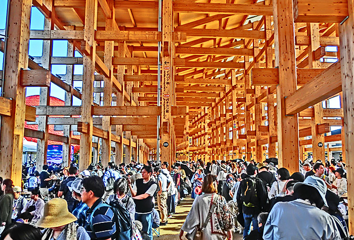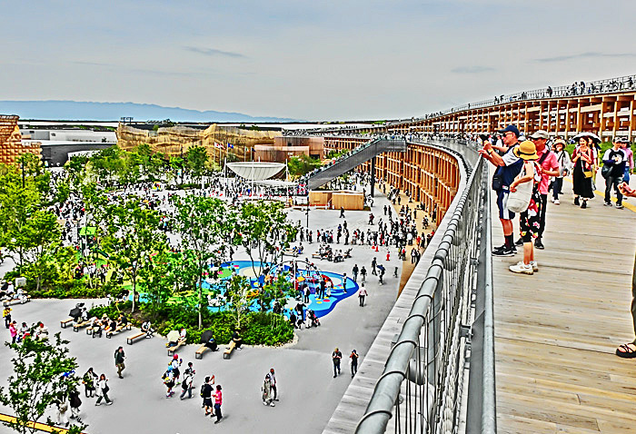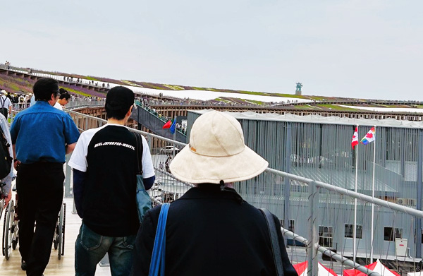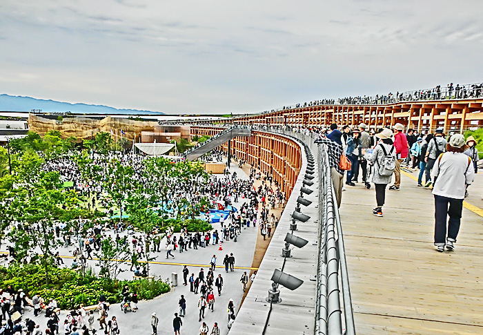 名物の「大屋根リング」(世界最大の木造建築で1周30分)の巨大さに驚きながら、エスカレーターでリングの上に登ってみると・・・