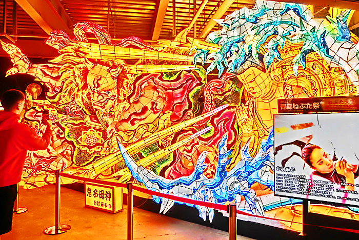 そして、こちらは、万博の主役のひとつ・・・そう、昨年の「ねぶた大賞」を受賞した、女性ねぶた師:北村麻子さん制作の「鬼子母神」が、堂々たる姿で飾られているんですよ。(右下の映像には、制作中の麻子さんが紹介されています)