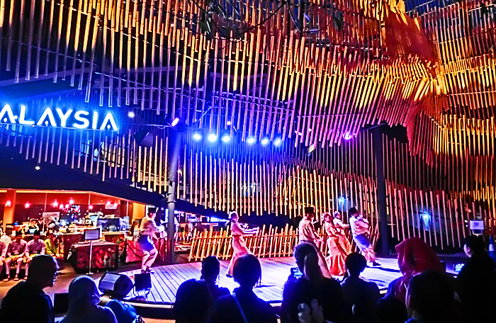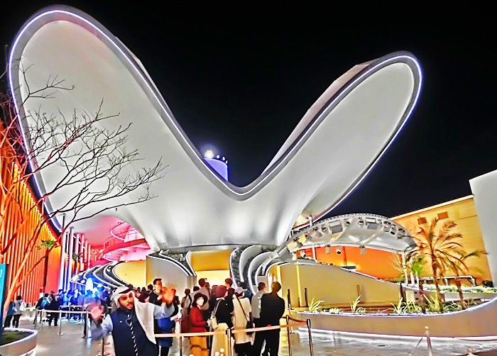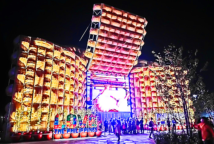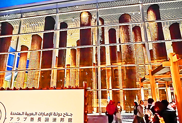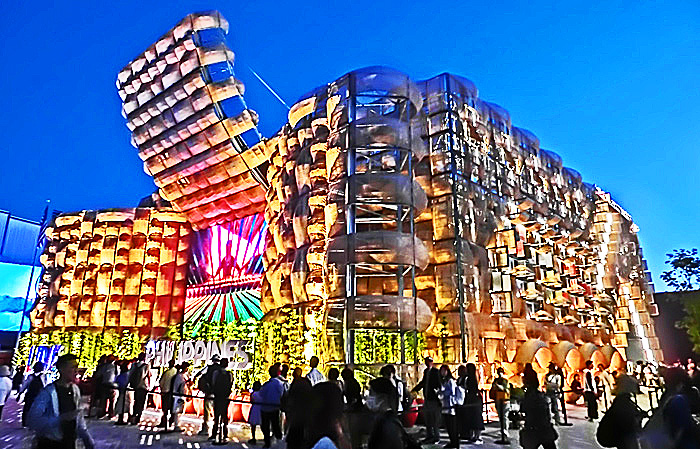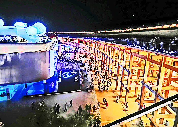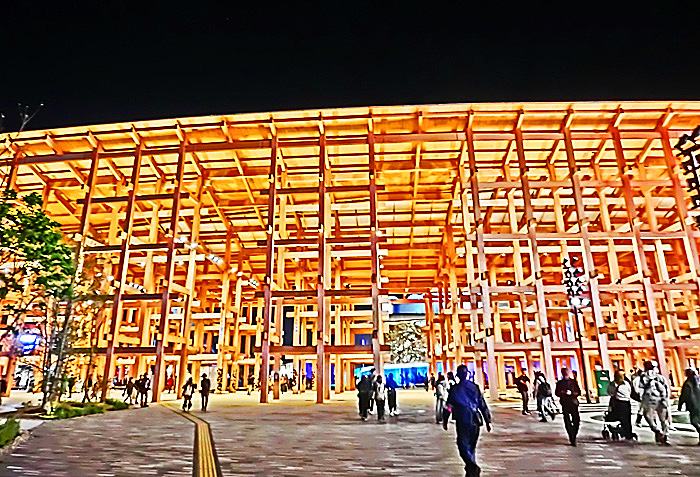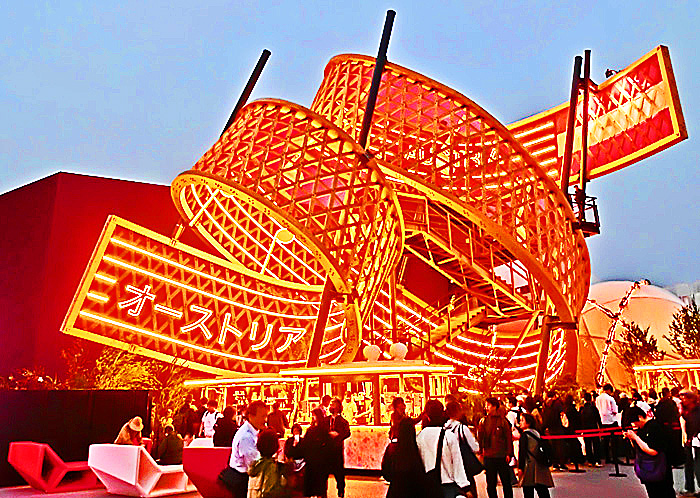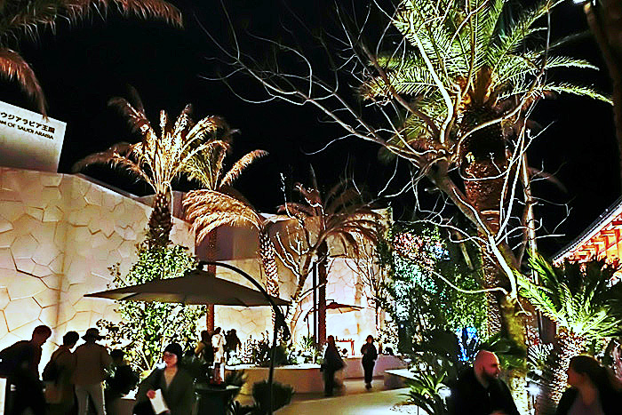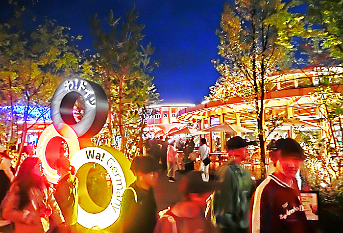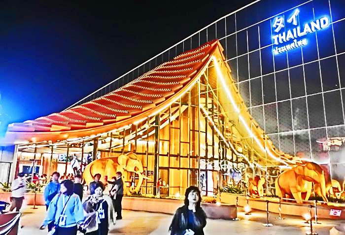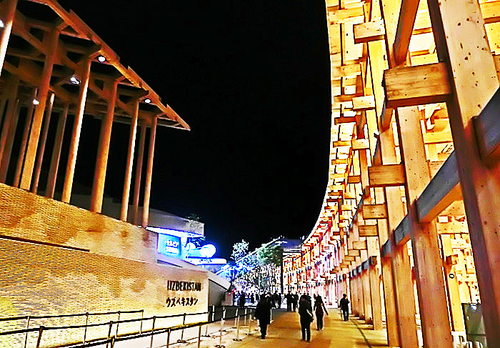 さて、格式高い英国館のパブで、優雅に「マンゴージュース」を飲んでから外に出ると、そろそろ日が暮れ始めて、会場内がキラキラと輝いてきましたよ・・・若者たちが、うっとりした表情で、写真を撮りまくっていますね。