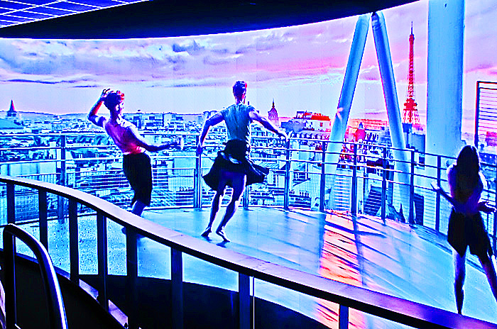 なぜか、「エッフェル塔」が見える高層ビルの屋上で、高度なダンスを踊る男女3名が、巨大な画面に映写されたり・・・