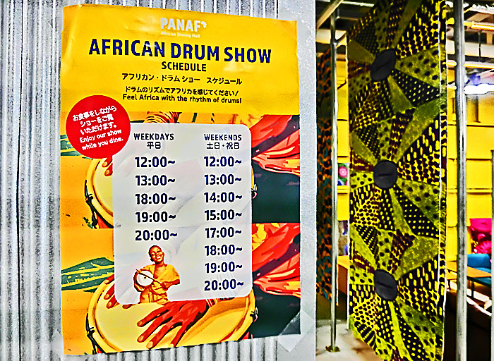 アフリカン・ドラムのショーは、こんな感じで繰り広げられるそうですから、めちゃくちゃ楽しそうですねぇ・・・この私も、ダンスで飛び入りしますから、皆さんもどうぞ!!