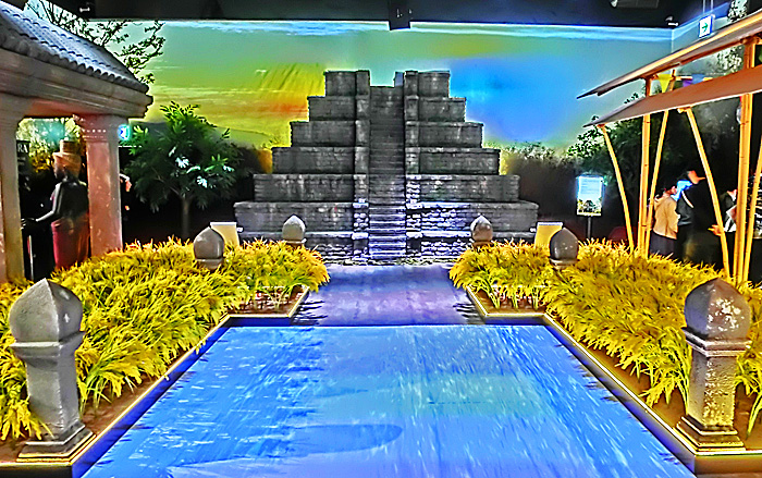 この「タイ館」の建物・・・実は、向こう側の半分は「鏡に映っているだけ」であり、実際の建物は、手前の半分だけなんですよ。この巧妙な錯覚効果を、見破ることができましたか?(恥ずかしながら、素直で純粋な私は、現場で目にして仰天するまでは、すっかり騙されておりました)