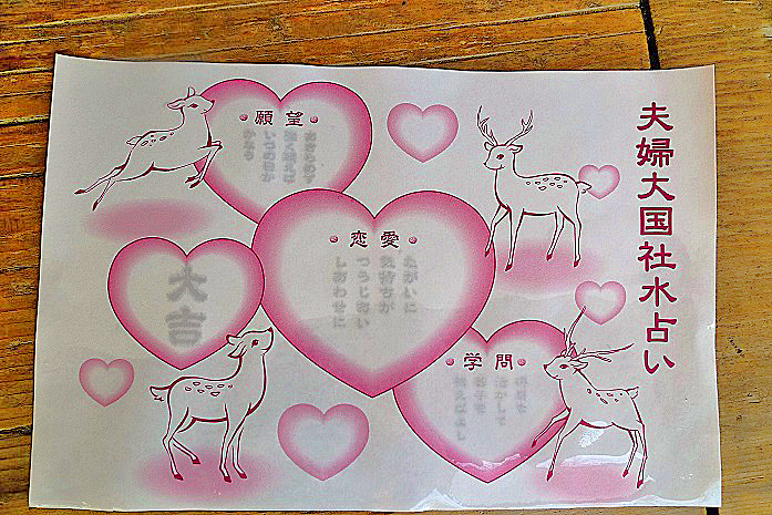 さらに、ご本殿の近くにある「夫婦大国社」というお社にも、お参りしました。こちらは、名前の通り、夫婦円満・良縁の神様をお祀りされていて、「水占い」というおみくじがあったので、私がひくことになりました。水に浮かべると、文字が浮き上がってくるという珍しいおみくじで、浮かび上がってきたのは、なんと「大吉」でした!!