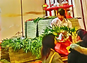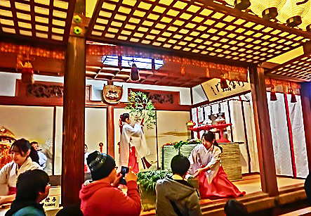 吉兆笹授与所の後方には、巫女(みこ)さんが「神楽」(かぐら)を舞ってくださる、風雅きわまる姿が・・・