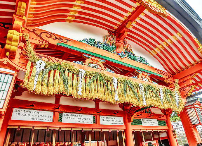 これが、本殿・・・伏見稲荷大社は、もともと、五穀豊穣(ごこくほうじょう)の神様ですから、本物の稲穂(いなほ)が、立派に飾られていますよ。(いつの間にか、「商売繁盛」の御利益の方が、有名になってしまいましたが・・・笑)