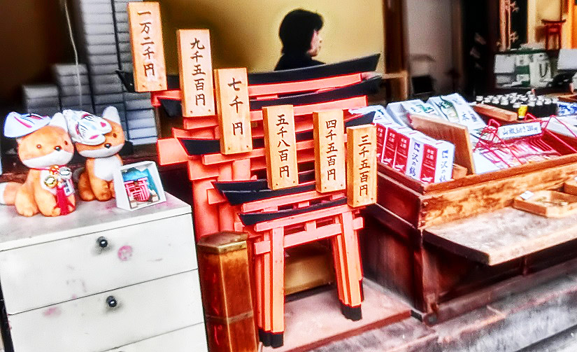 この由緒正しいお店では、奉納する鳥居を、購入できますよ。ご覧のように、大きさによって値段が異なるのですが、最小サイズで三千五百円、最大サイズで一万二千円ですから、大きいサイズを購入する方が、かなりお得となっております。