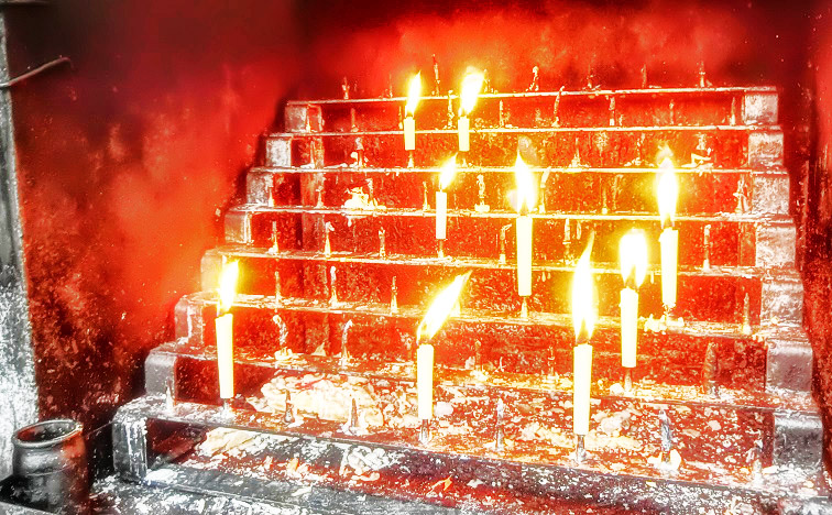 社の横の燭台(しょくだい)で揺らめく、ローソクたちの炎でさえも、とても幸せそう!!(笑)