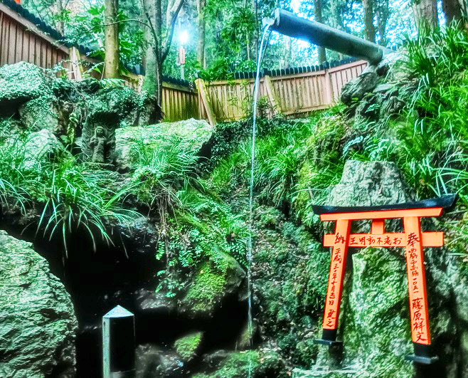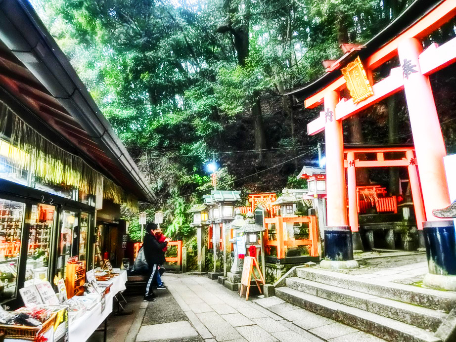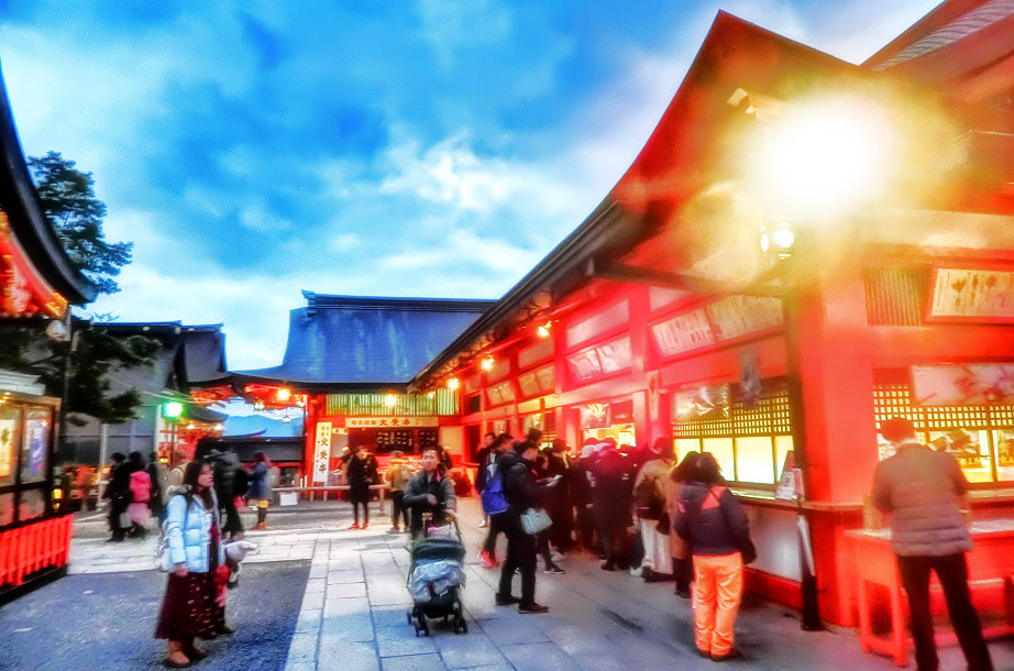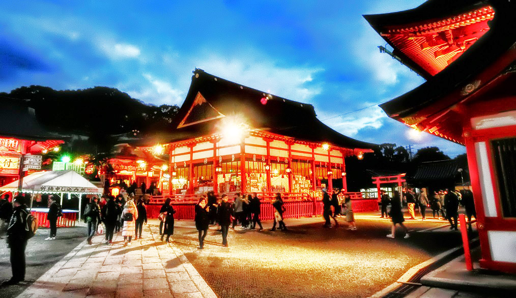 時刻が午後5時を過ぎて、夕暮れ時の稲荷大社は、鮮やかにライトアップ。