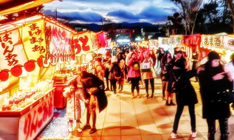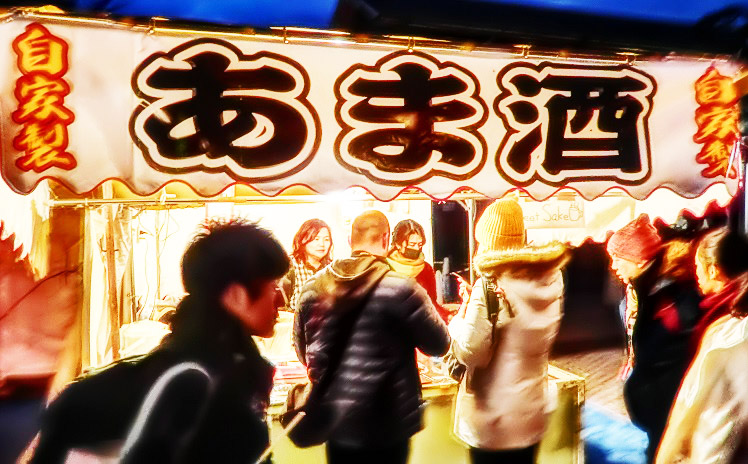 夏の「祇園祭り」の屋台と違って、「あま酒」のお店も出ているのが、寒い時期の特徴。