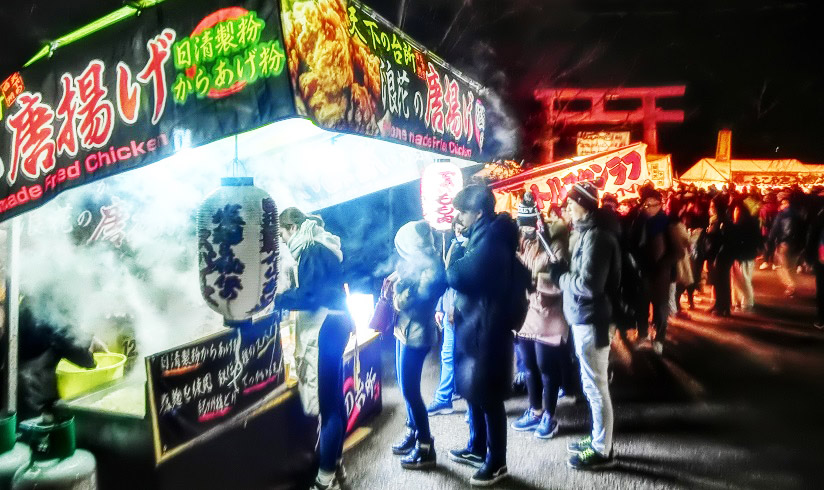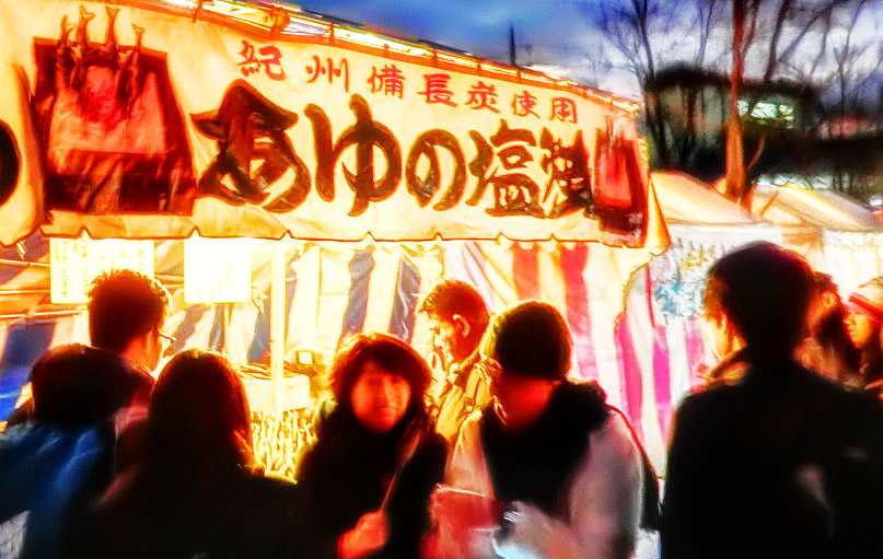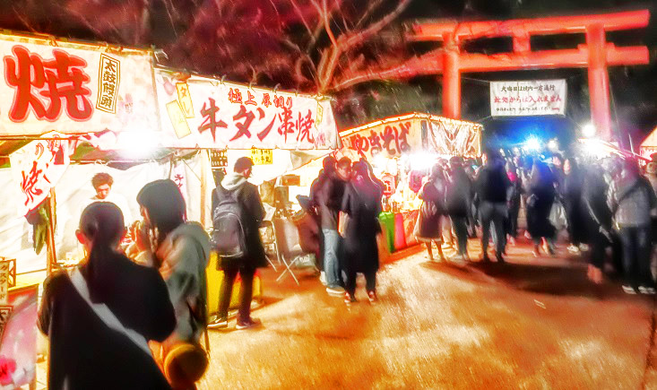 大鳥居の前の参道には、いつの間にか、たくさんのお店が居並んで、威勢の良いかけ声が、飛び交っていますよ。