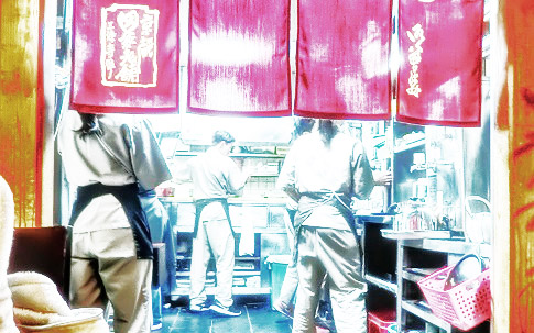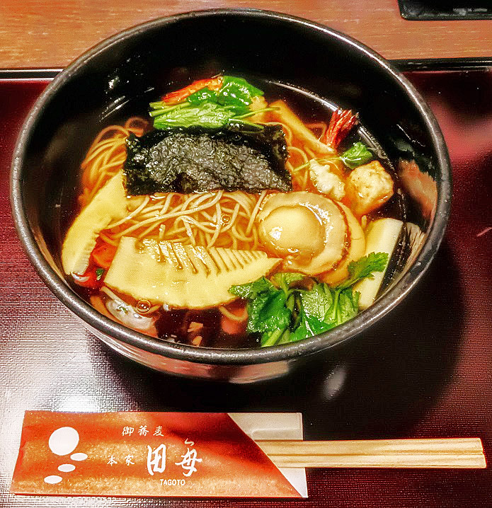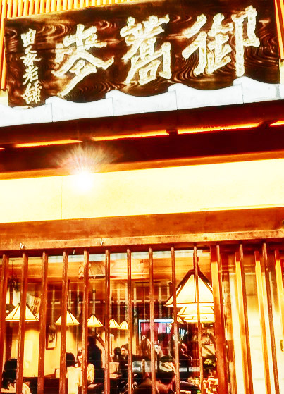 三条通りに戻った我々は、「光の学校」から徒歩2〜3分の距離にある、有名な老舗(しにせ)の「蕎麦(そば)屋」さんへ・・・おっと、すでに、お店の外まで、行列ができていますよ。(店内でも、10名以上が待っている状態)